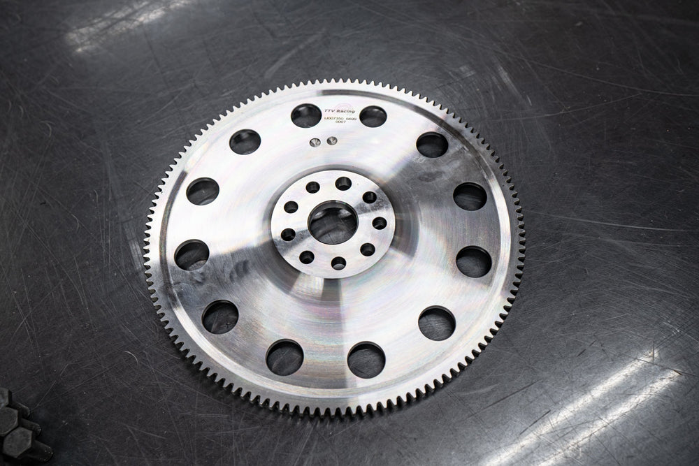 The design incorporated the required crank sensor tabs, its one larger gap, and the starter gear teeth. It also has one larger crankshaft bolt hole for starter alignment. TTV has 2x in-house high speed balancers to achieve proper balancing to OE specs. The balancing is done using machined holes across the circumference of the flywheel.